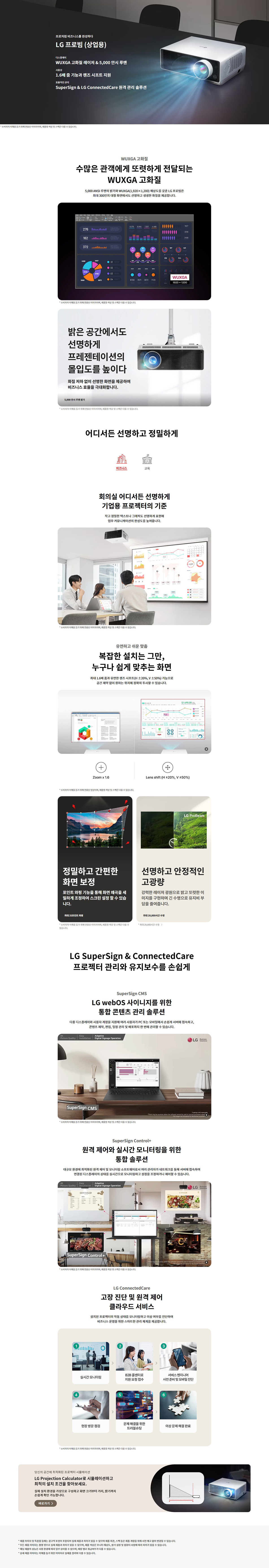 WUXGA 고화질 레이저 & 5,000 안시 루멘1.6배 줌 기능과 렌즈 시프트 지원SuperSign & LG ConnectedCare 원격 관리 솔루션